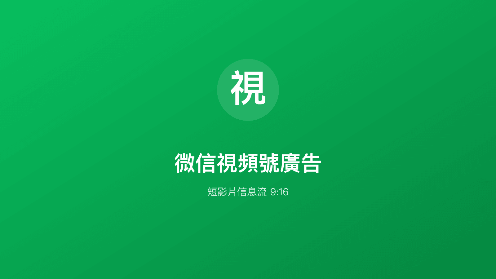視頻號(Channels)係微信內嵌嘅短影片平台,與朋友圈共生。廣告以 9:16 直幅短影片信息流形式呈現。